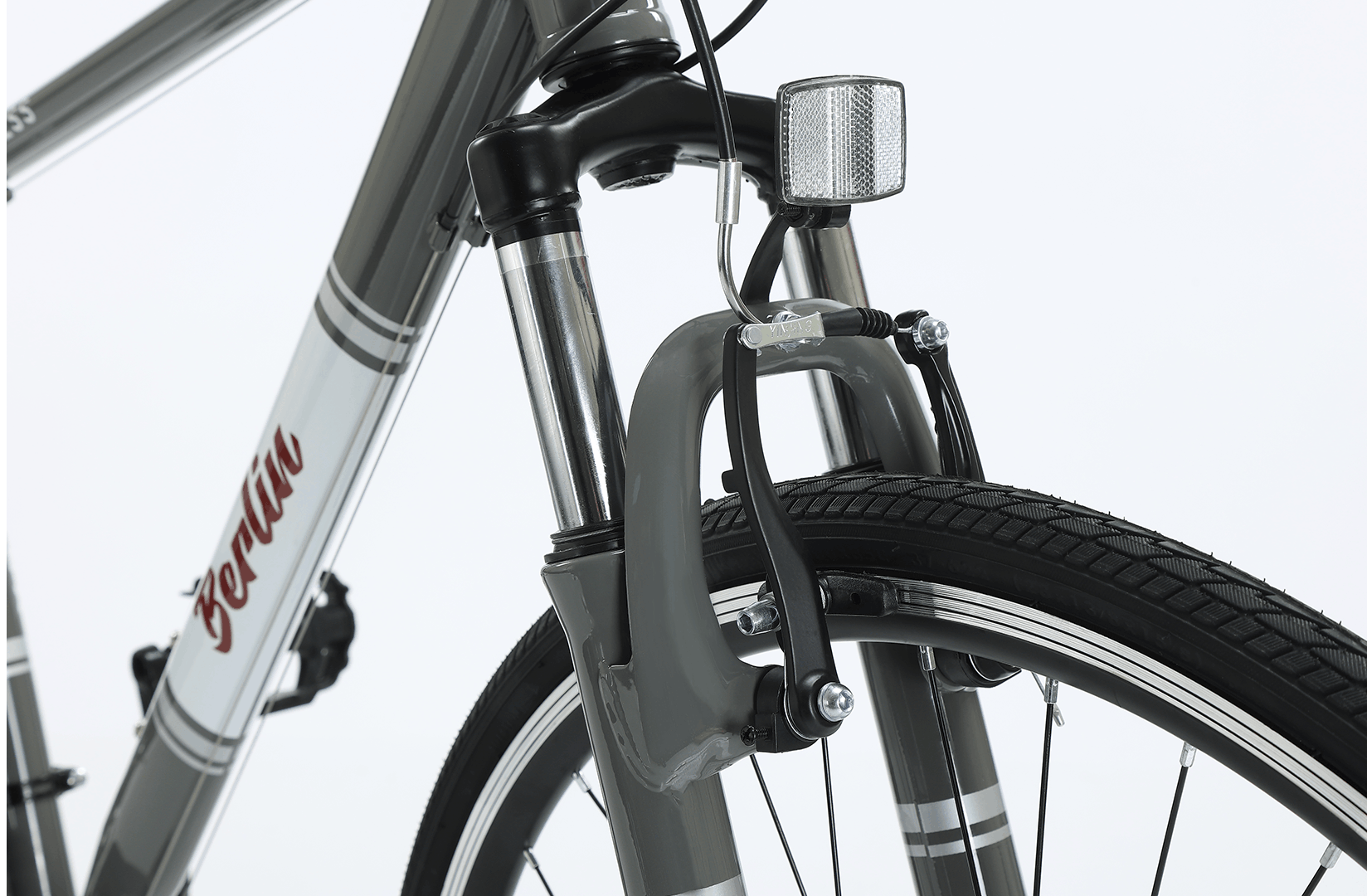 Ravno jekleno krmilo, udoben MTB sedež in pedala z odsevniki prispevajo k udobju in varnosti. Zadnje jekleno stojalo omogoča enostavno parkiranje, zaradi česar je BERLIN 28" odlična izbira za urbano uporabo.