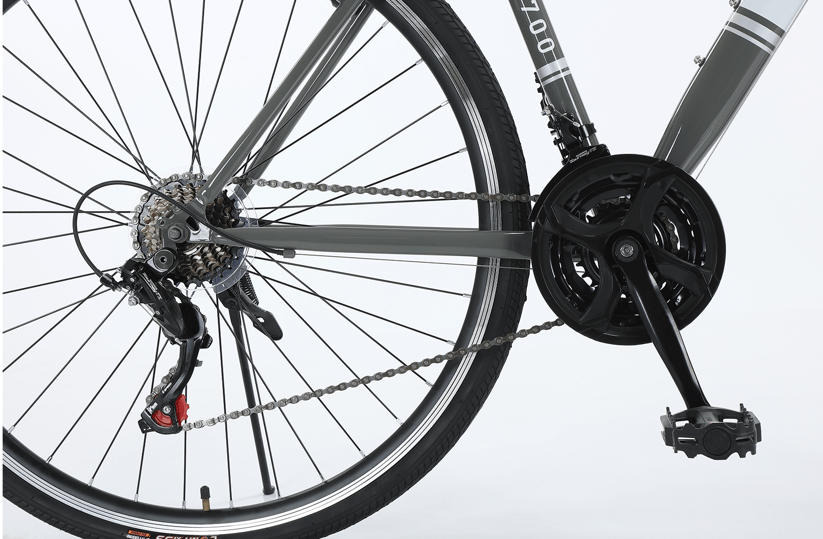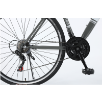 Kolo je opremljeno s Shimano 21-prestavnim sistemom (3×7), ki omogoča enostavno prilagajanje različnim terenom. Aluminijaste V-zavore zagotavljajo zanesljivo in varno zaviranje.